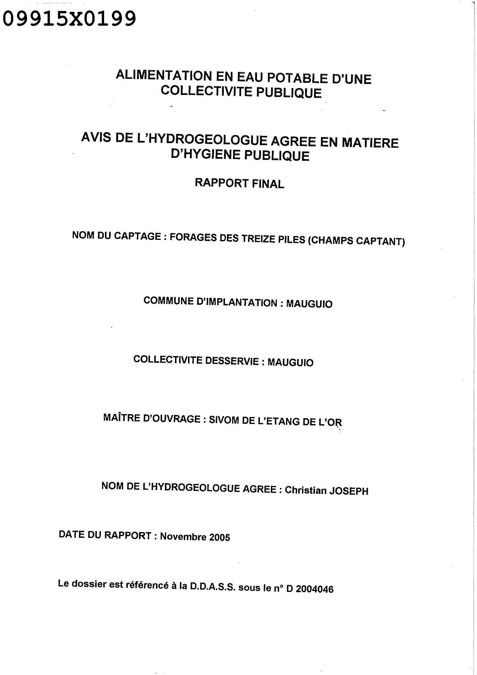 RAPPORT JC GRILLOT ET C DROGUE DE FEVR 1988- VOIR DOSSIER 09915X0198. DDASS 42 - RAP. C.JOSEPH 11/2005 - DOSSIER DDASS : 2004046