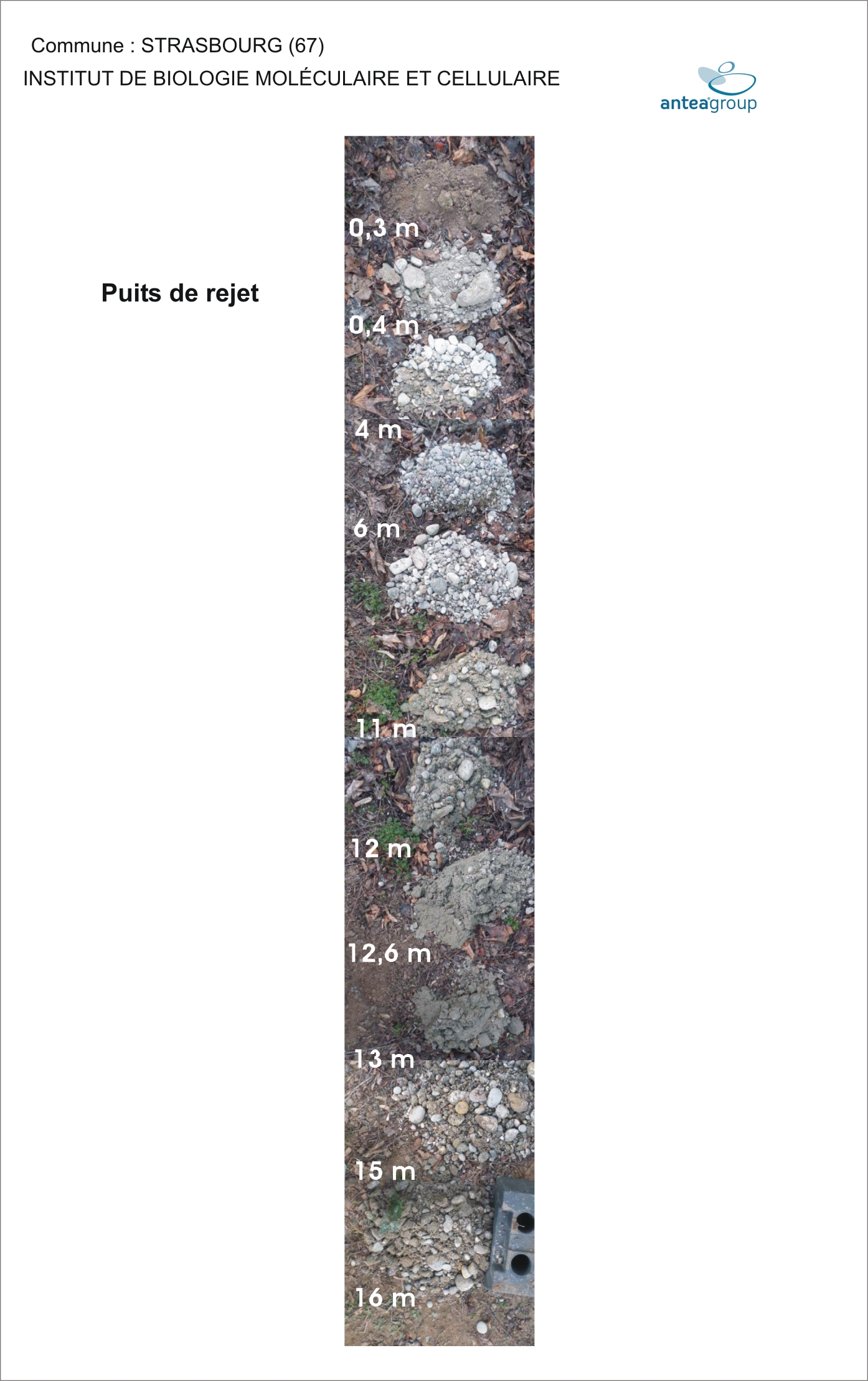 | De 15 à 16 m | Sable gris: 40%, graviers: 60% (0.5 - 2 cm) | QUATERNAIRE |